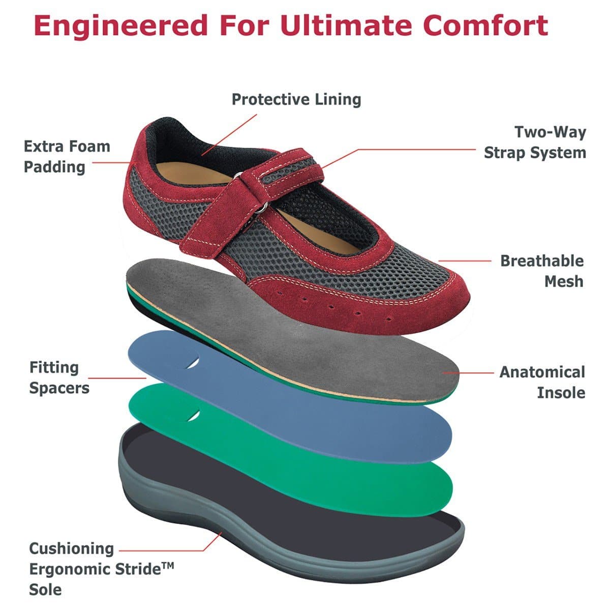 Causal Mary Jane packed with comfort features for days on the go! Orthofeet's Chattanooga - Red women’s casual shoes are designed with a breathable fabric upper and soft padded interior for a non-binding fit. Chattanooga features a two way strap system that allows fit adjustment on both sides of the shoe and offers easy on/off wear. The round and wide toe box provide maximum protection against pressure points and ample room for toe movement. Their anatomical orthotic insoles and ergonomic soles provide comfortable support and excellent cushioning, making Chattanooga - Black the perfect shoes for a variety of conditions, including plantar fasciitis, diabetes, neuropathy and arthritis.