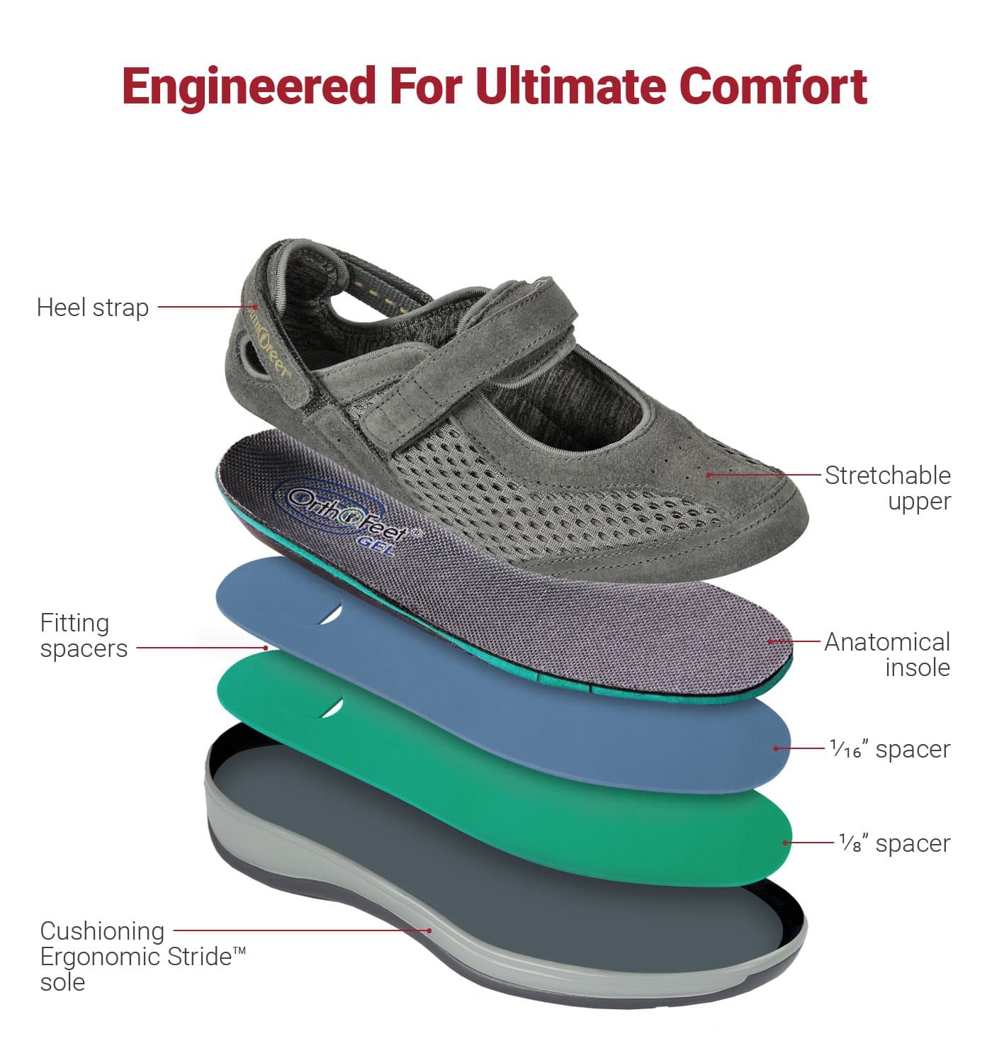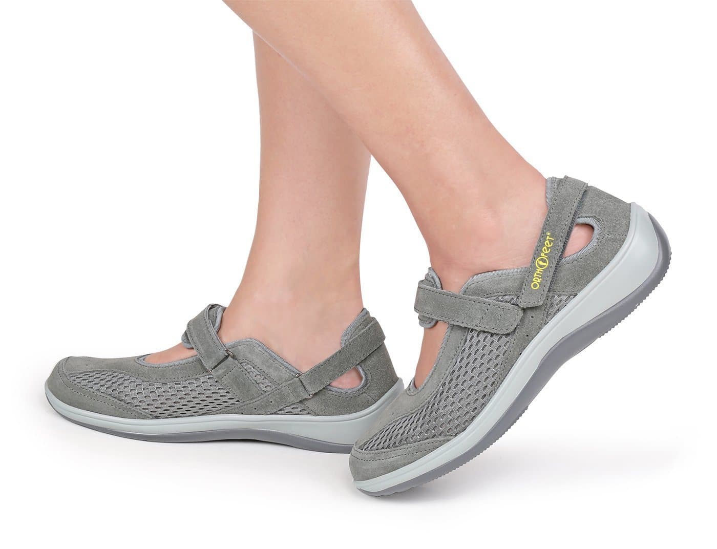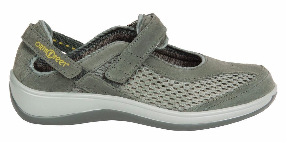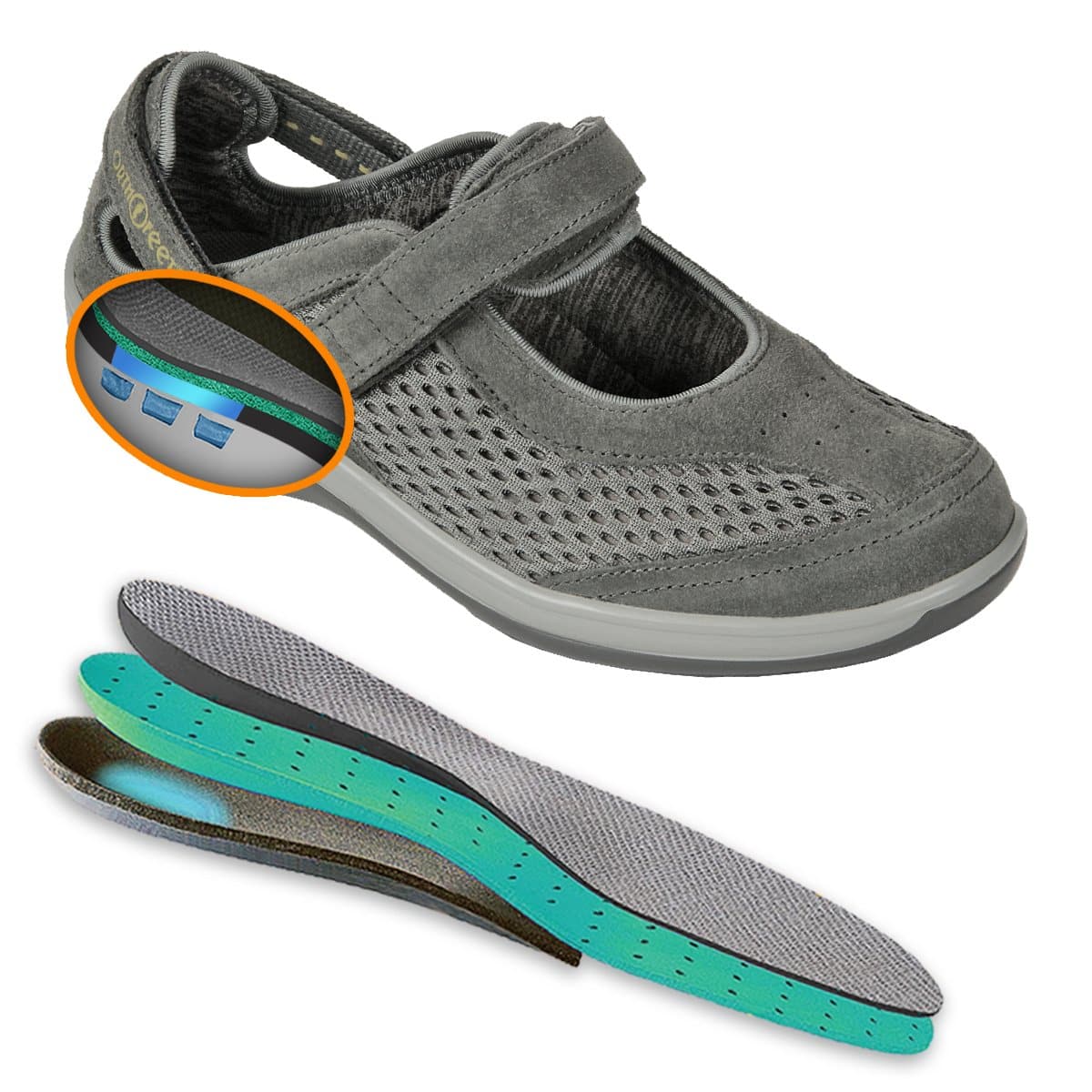 Orthofeet's Sanibel - Gray Mary Jane shoes for women offer a cute accent to virtually every outfit. The Sanibel is designed with ample adjustability to offer a customized fit - a hook and loop strap around the instep and one in the heel that allows you to adjust the grip and prevent slippage. A wide shape, extra depth and wide, round toe box create a pressure free fit and provides extra room for toe movement. Sanibel is designed with a built-in orthotic insole and ergonomic soles to support the arch, align the body, cushion the feet and facilitate foot motion. Walk comfortably and pain free with the Sanibel Mary Jane shoe!