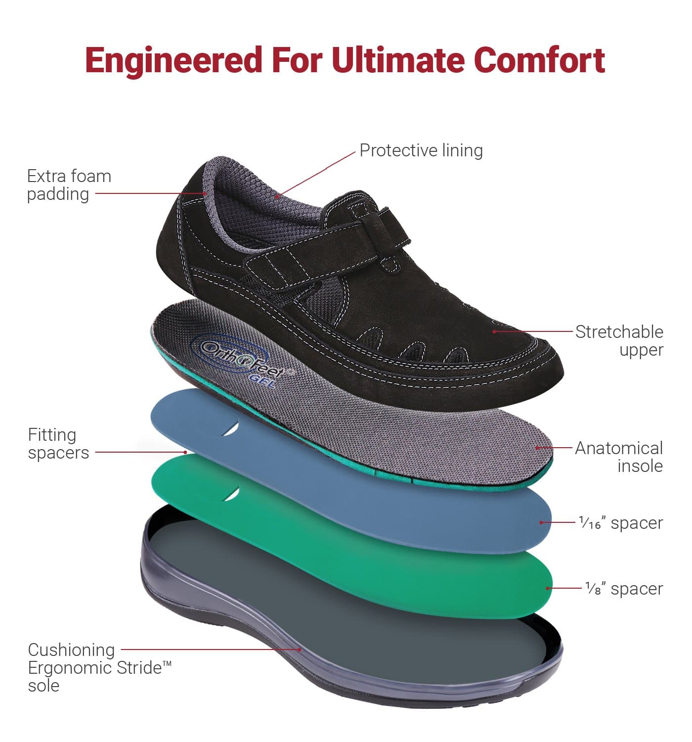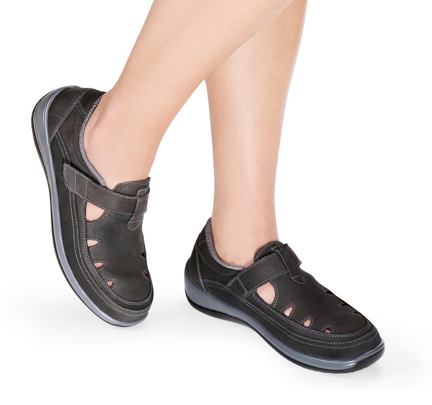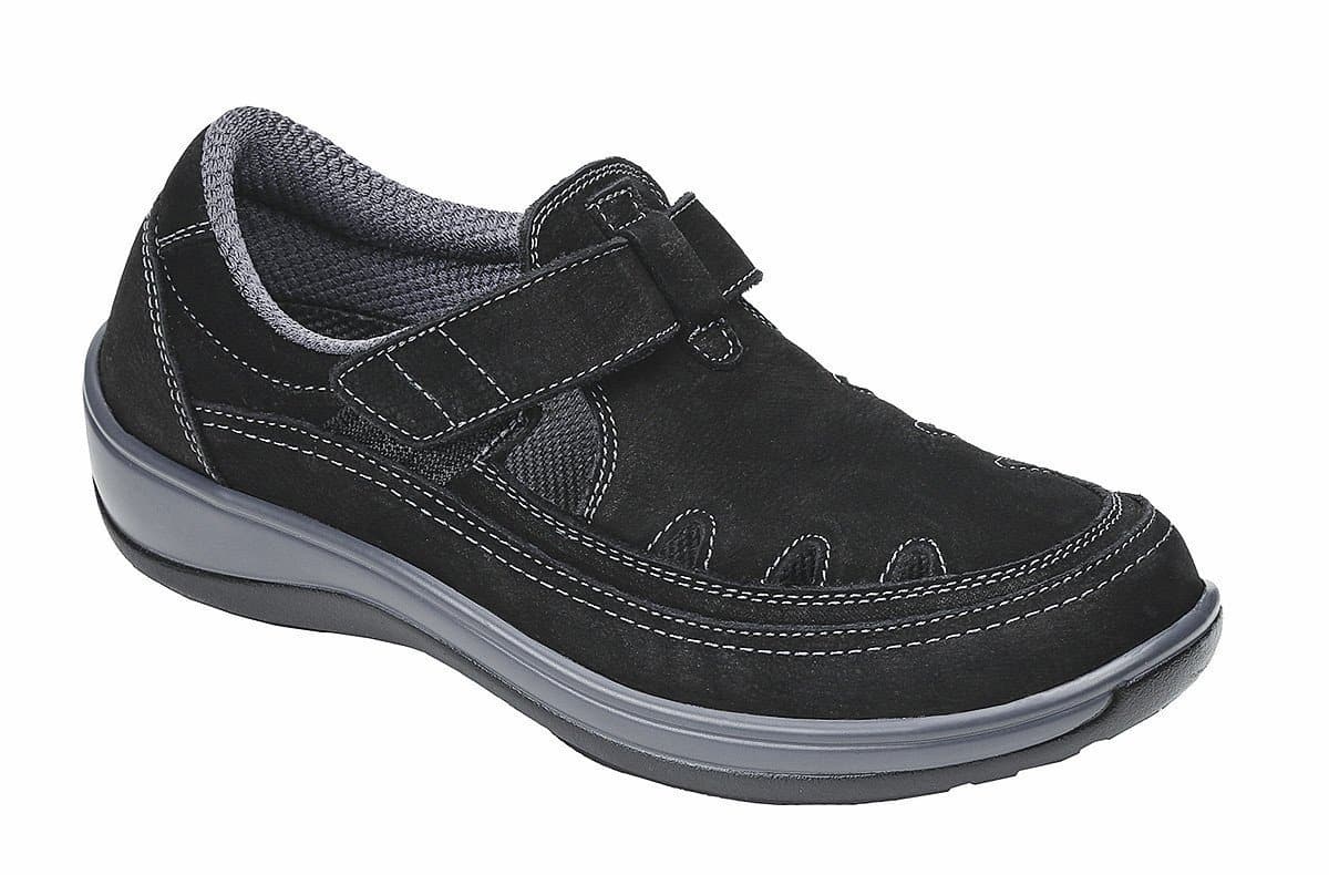 Enjoy exceptional comfort and fit with Orthofeet's Serene – Black women’s casual shoes that offer a non-binding fit, extra room for toe movement, and maximum protection against pressure points. Their anatomical orthotic insoles and ergonomic soles provide comfortable support and excellent cushioning, making Serene – Black superior women’s orthopedic shoes for a variety of conditions, including plantar fasciitis, diabetes, neuropathy and arthritis.